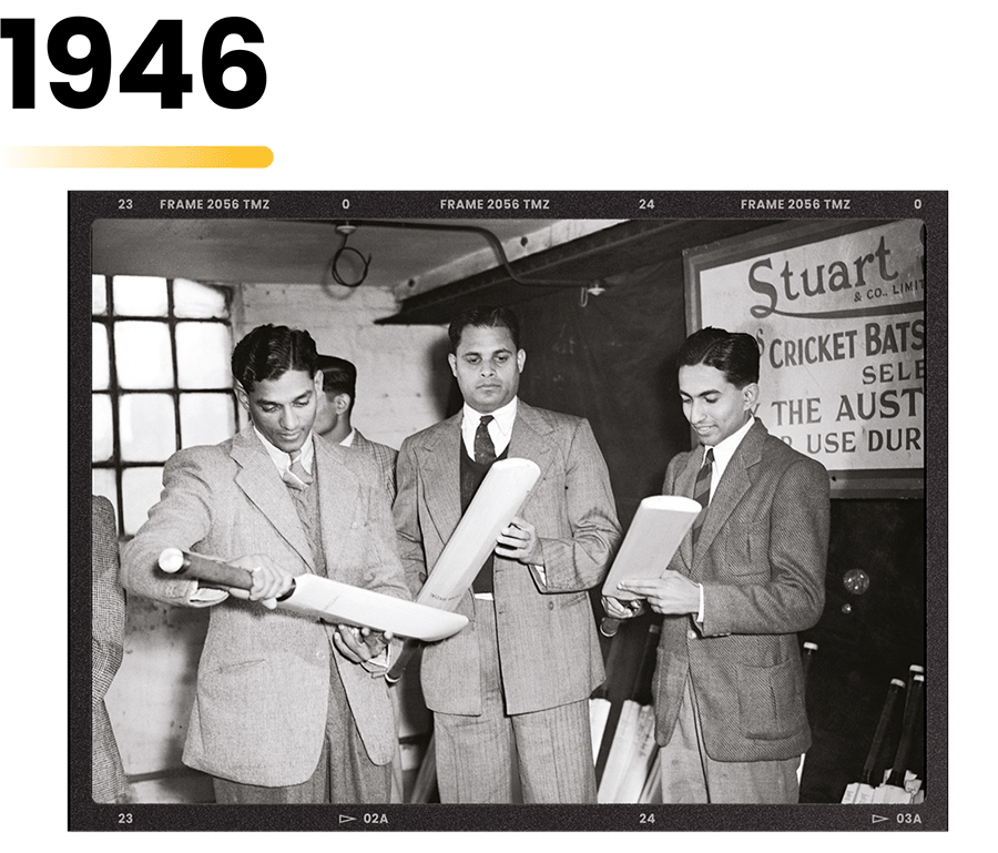 Indian players picking up their bats at the Stuart Surridge factory. An increasing demand for English cricket bats came from all over the world. Stuart Surridge cricket bats were used by the Indian team for the game against England, the first test match in ten years.