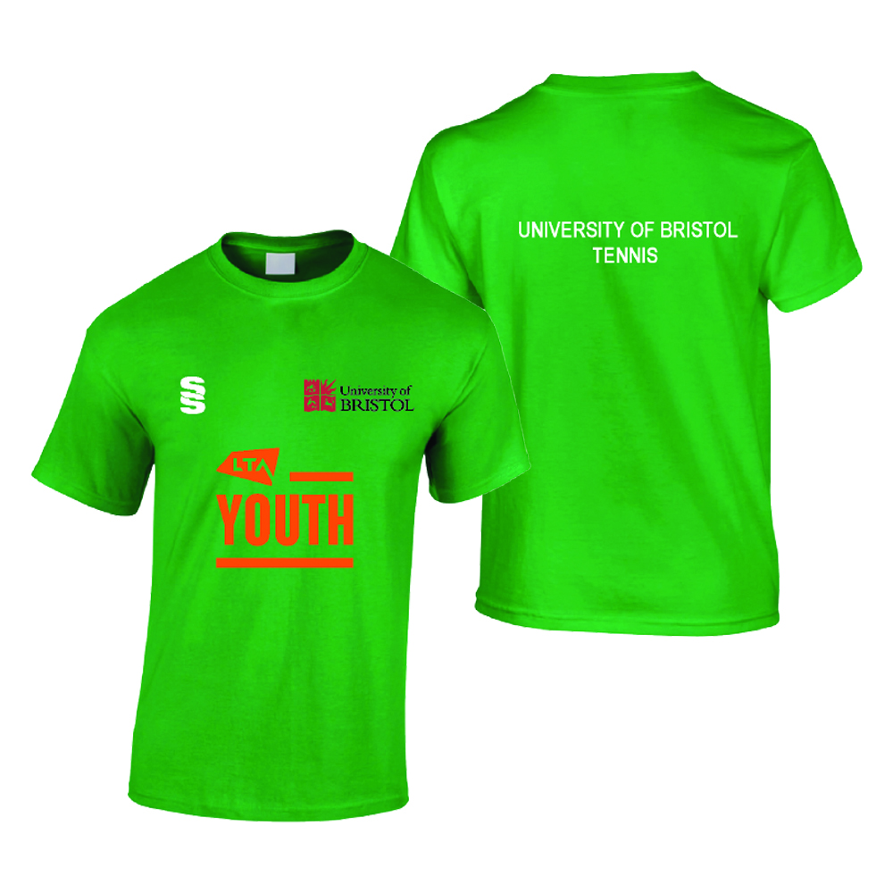 University of Bristol Tennis T-Shirt, with University of Bristol logo printed to left chest and white SS printed to right chest. LTA logo printed in range to chest centre, and University of Bristol Tennis printed to reverse in white.